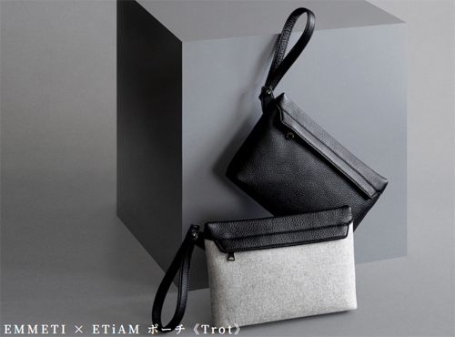 ETiAM バッグのサイトを眺めていると、まず目に飛び込んでくるのがEMMETIとのコラボポーチ《Trot》や、《Prior》シリーズ。
