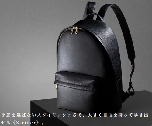 たとえば、丸みを帯びたラウンド型が印象的な「キャンバス バックパック《Strider》 - Deep Black -」は、独特の凹凸模様が美しいシュリンクレザーと落ち着いた墨黒のキャンバス生地を組み合わせたスタイリッシュなアイテムです。